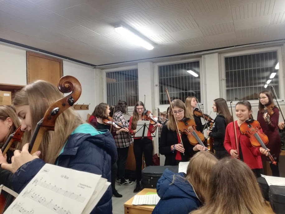 Doch nicht nur der Oberstufenchor ist nach wie vor aktiv beim Musizieren in diesem Corona-Schuljahr. Auch Big Band, Juniororchester und die Streicherklassen proben mit großem Einsatz und unter extrem schwierigen Bedingungen: Jahrgangsstufen dürfen nicht vermischt werden, mal ist nur ein Teil der Schüler im Präsenzunterricht, mal ein anderer in Quarantäne. Chorsänger und Blasinstrumente dürfen schon länger aufgrund des erhöhten Aerolsolausstoßes nur noch über Distanz- oder Einzelunterricht mit den Musiklehrerinnen arbeiten. Doch auch die Proben des Streichorchesters haben sich komplett verändern müssen, da nun nicht mehr nach Stimmgruppen, sondern nach Jahrgangsstufen geprobt wird.