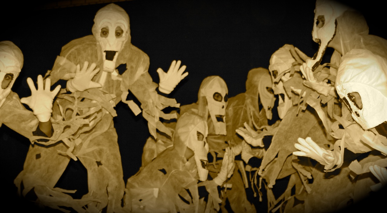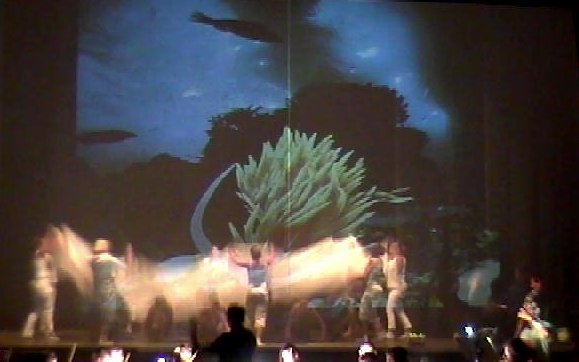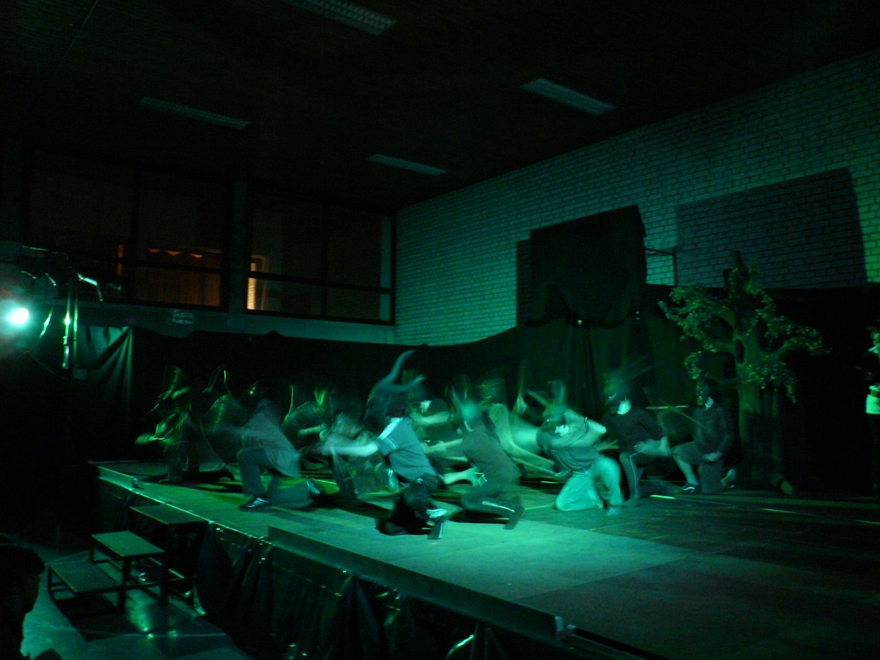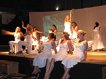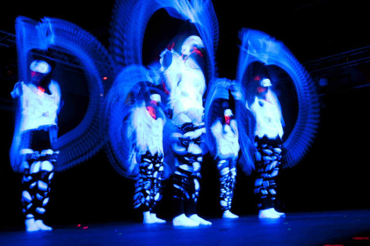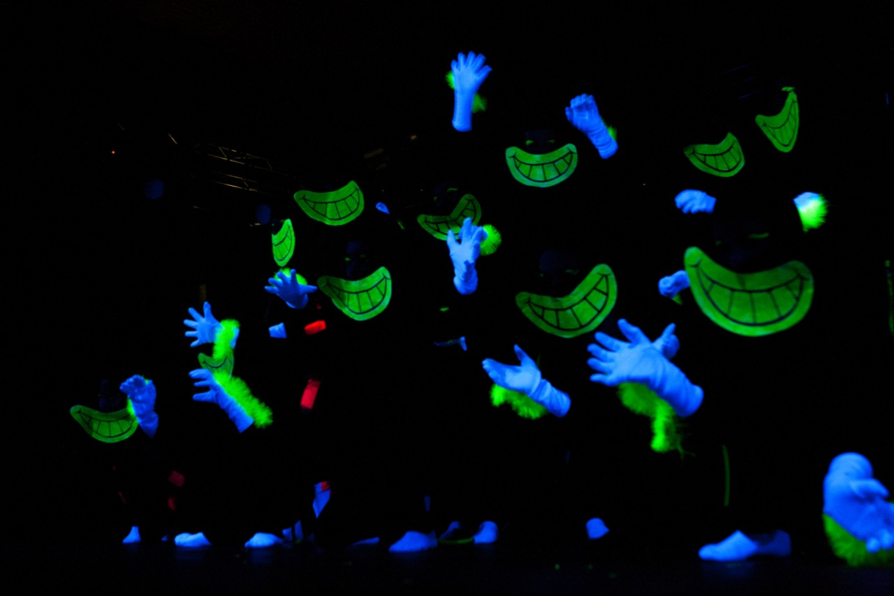 Einige Mädchen aus der Q11 waren so begeistert vom Tanzen, dass ihnen die „Pflicht“ nicht reichte und sie zu ihrer selbst choreographierten „Kür“ etwas ganz besonderes darboten: „Minnih the Moocher“ wurde im Schwarzlicht getanzt, in dem lediglich wenig weißer Stofff sichtbar war. Praktisch körperlos wirbelten so Beine und Hände durch die Dunkelheit – magisch.