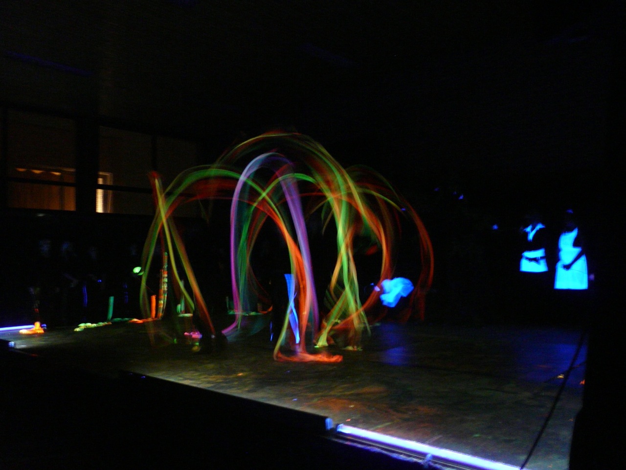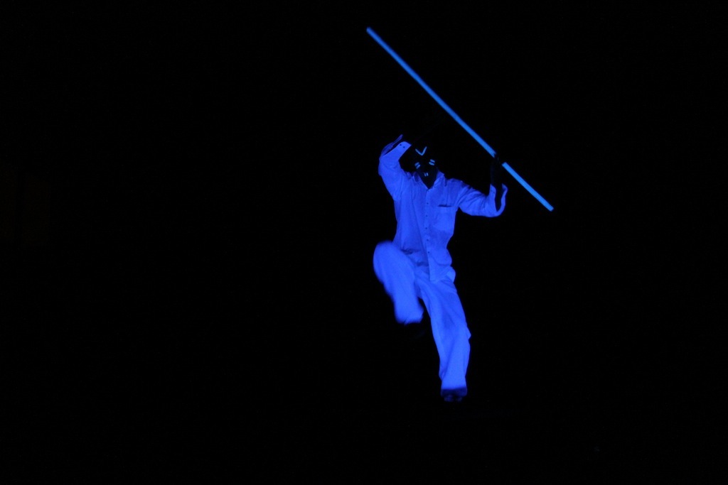 Einige Mädchen aus der Q11 waren so begeistert vom Tanzen, dass ihnen die „Pflicht“ nicht reichte und sie zu ihrer selbst choreographierten „Kür“ etwas ganz besonderes darboten: „Minnih the Moocher“ wurde im Schwarzlicht getanzt, in dem lediglich wenig weißer Stofff sichtbar war. Praktisch körperlos wirbelten so Beine und Hände durch die Dunkelheit – magisch.
