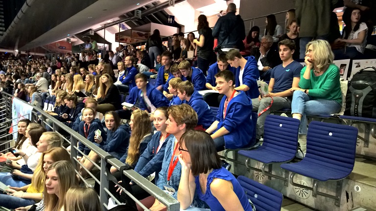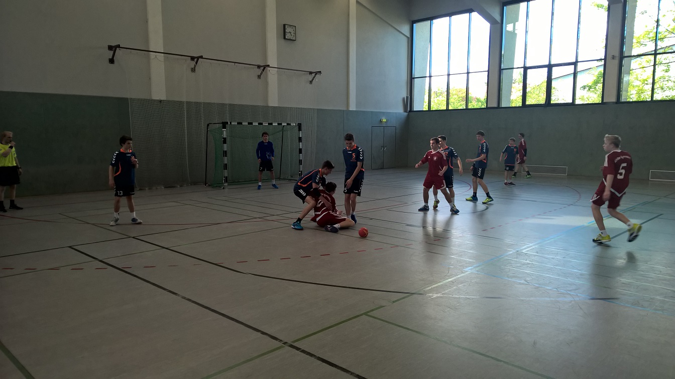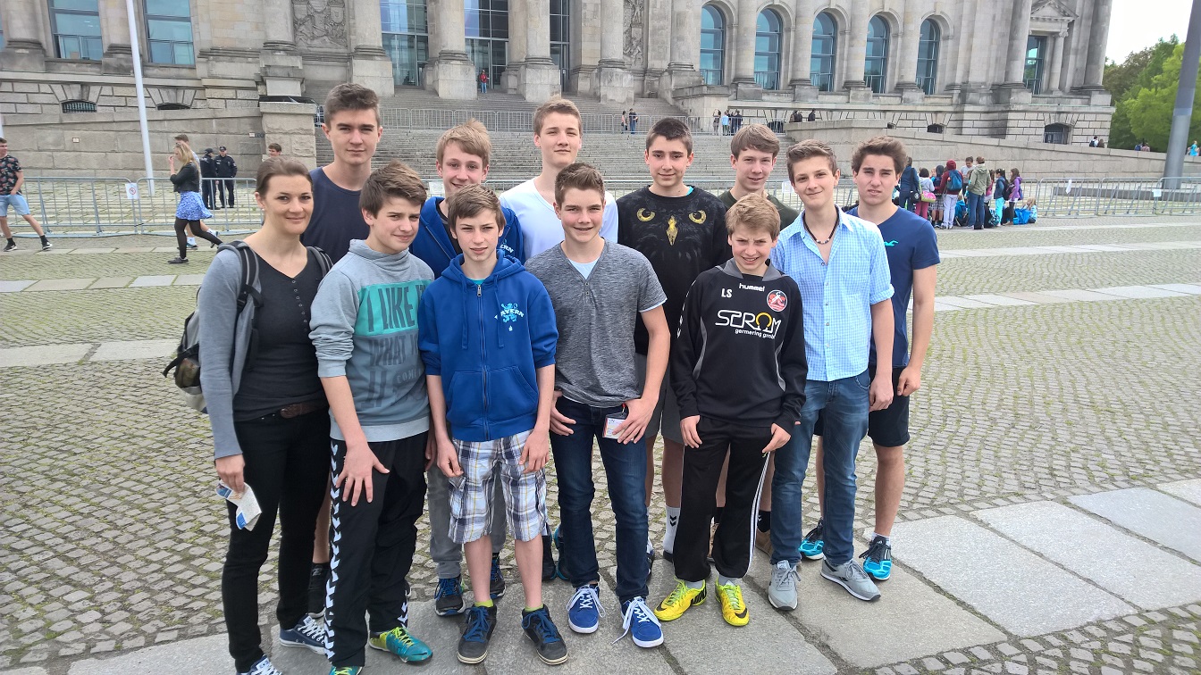 Bevor es am 2.Tag nachmittags mit den Spielen losging, besichtigten wir einen kleinen Teil unserer großen Hauptstadt Berlin: Vom Bundestag aus liefen wir durch das Brandenburger Tor und „Unter den Linden“ entlang bis zum Alexanderplatz. Nachmittags spielten wir dann in der Gruppenphase gegen Saarluis (Saarland), den Bundesfinalsieger die Sportsekundarschule Magdeburg (Sachsen-Anhalt) und gegen Hameln (Niedersachen). Unglücklicherweise verletzte sich Vincenzo unser Torwart beim zweiten Spiel und Leander einer unser Topscorer musste ins Tor. Leider verloren wir diese Spiele knapp und wurden dadurch Gruppenletzter. Die Stimmung war am Boden. Aus diesem Grund mussten wir am kommenden Wettkampftag um die Plätze 9 – 16 spielen. Vincenzo erholte sich im Laufe des Vormittags und wir konnten wieder in alter Stärke spielen. Dank zweier souveränen Siege gegen Eisenach (Thüringen) und Aue (Sachsen) überholten wir alle und wurden nach dem Vormittag des zweiten Tages dadurch Gruppenerster und durften am Nachmittag um den 9. Platz gegen Wiesbaden (Hessen) spielen. Nachdem wir in diesem Spiel zur Halbzeit mit 5 Toren hinten lagen, schafften wir es in der 2. Hälfte, uns bis zum Unentschieden heran zu kämpfen. Leider gingen uns in der Schlussphase die Kräfte aus und so verloren wir das Spiel um Platz 9 mit drei Toren. Trotzdem konnten wir stolz auf uns sein, weil wir mit dem 10. Platz nach Hause fuhren. Zehntbeste Handball-Schulmannschaft Deutschlands!!! Am Freitag schauten wir uns vormittags noch das Finale an, besichtigten nachmittags das Holocaust-Denkmal und abends gab es für alle Sportler eine großartige Abschlussveranstaltung mit den Siegerehrungen aller Sportarten und beeindruckenden Showacts. Samstagmorgen fuhren wir dann nachhause.