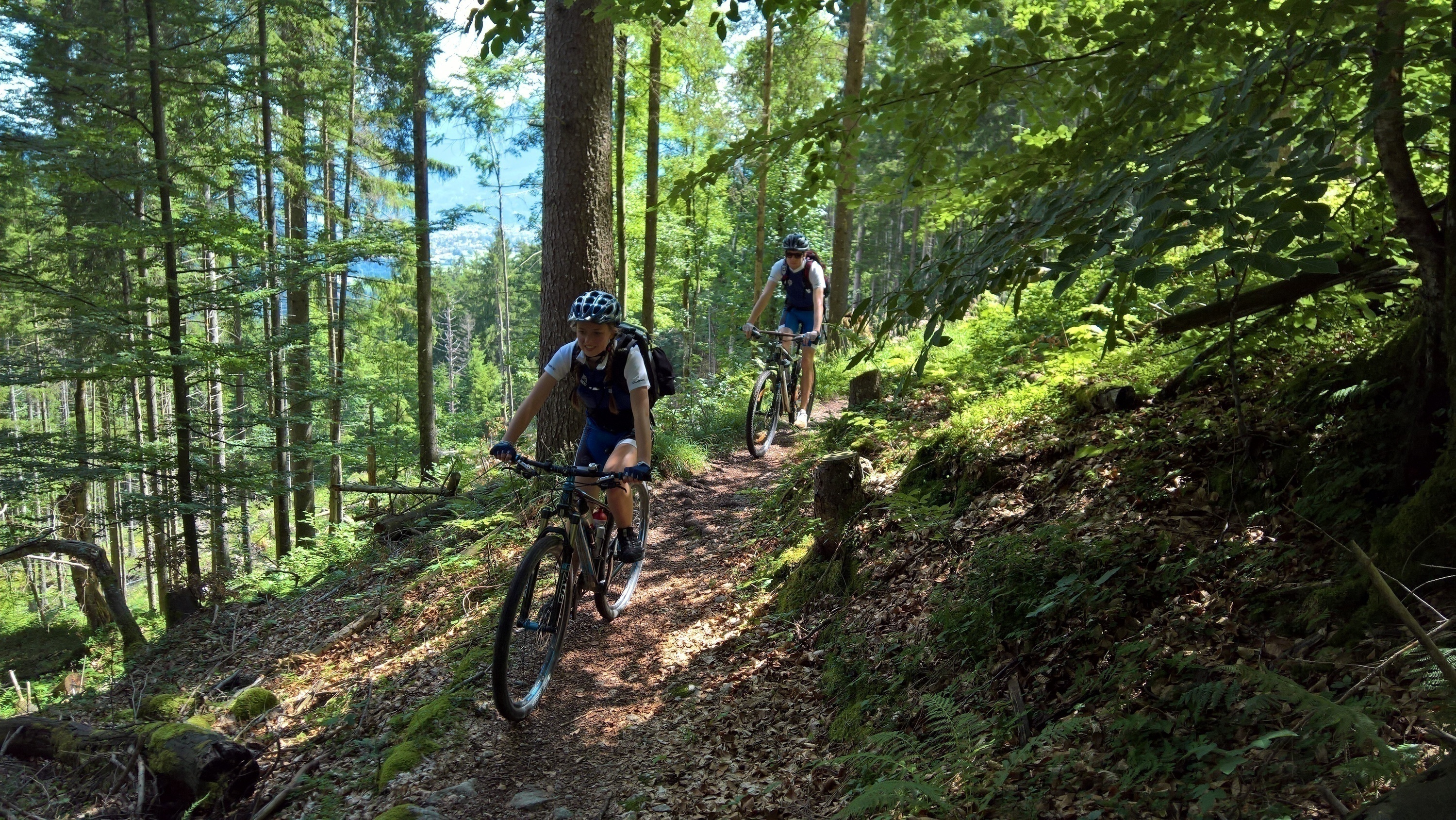 Als wir oben angekommen, unsere Jacken anzogen und uns auf eine schöne Belohnung in Form einer Serpentine oder ähnliches freuten, fuhren wir erst ein Stückchen Straße und dann bogen wir auf einen Trail in den Wald ab. Nach wenigen Höhenmetern bergab war es schon zu steil und alle mussten absteigen und schieben.