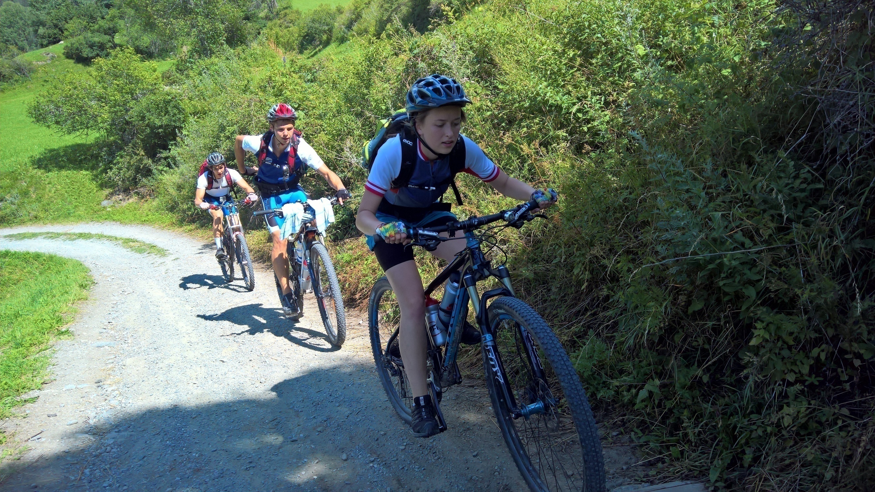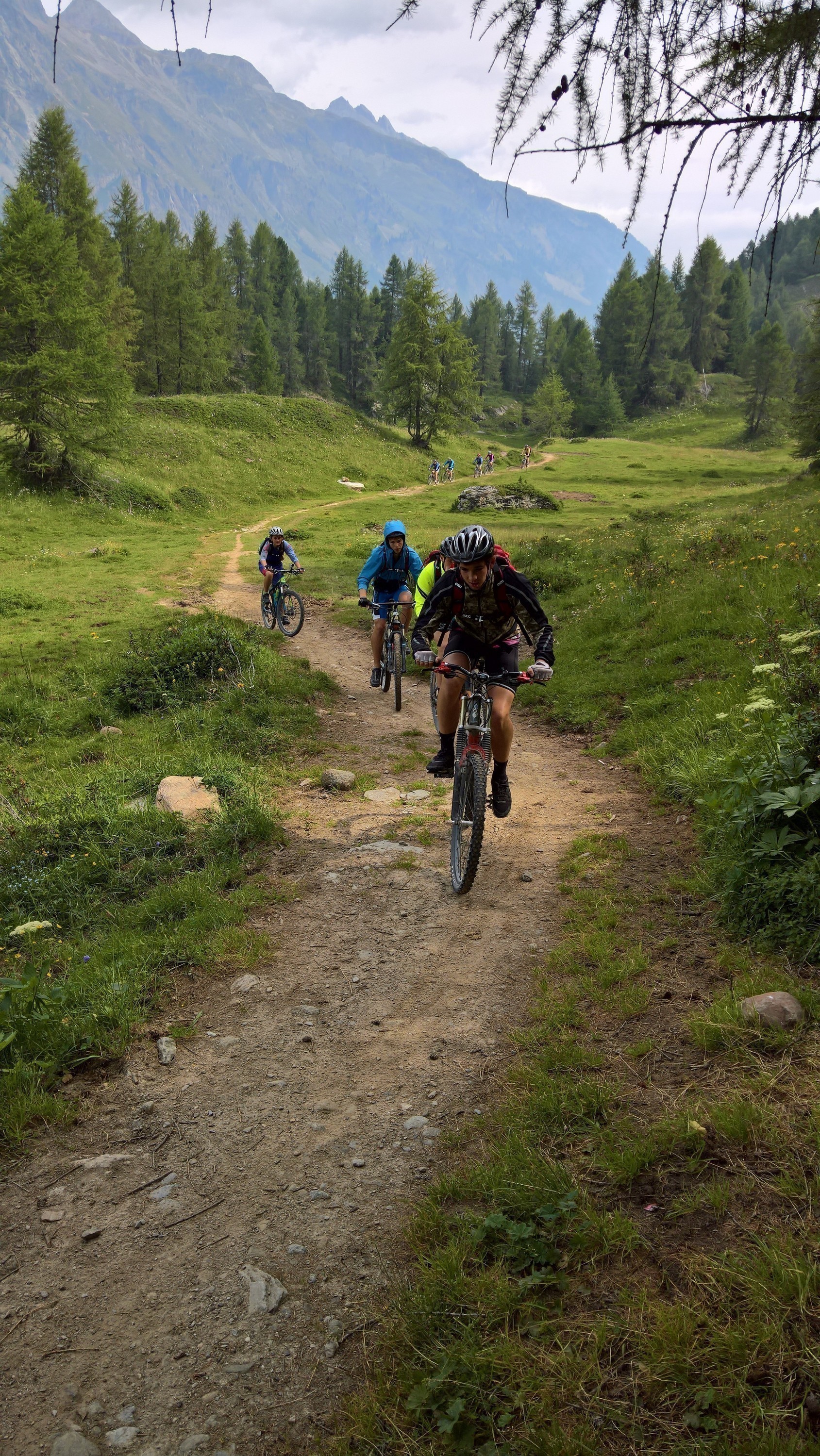 Da wir erst um 8 frühstücken konnten, haben wir zuerst alles ins Auto verladen und sind gleich nach dem Essen von Ried aufgebrochen. Weil wir heute die Schweizer Grenze überquert haben, müssten einige eine kurze Strecke zurück fahren, um ihre Ausweise zu holen. Dann ging es aber endlich los. Die erste Tagesetappe bestand aus 50km dafür aber wenig Steigung. Trotzdem gab es einige Trails mit steileren Schiebepassagen und außerdem haben wir die Anstrengung der letzten Tage in den Beinmuskeln gespürt. Wir haben trotz der Hitze fast keine Pausen gemacht und dabei erfolgte der zweite Sturz der Tour durch Herr Borger. Mittagessen gab es wie gestern schon auf einem Kinderspielplatz in einem kleinen Dorf namens Scoul. Zu Ende der Pause zogen die ersten Gewitterwolken auf und wir statteten uns dementsprechend aus. Bei Regen, und vorbeiziehenden Gewitter kämpften wir uns in Serpentinen den Berg hinauf. Auf dem Weg zu unserer Unterkunft in Susch fuhren wir an vielen Häusern mit rätoromanischer Aufschrift vorbei, wie uns Tassilo erklärte. Insgesamt kamen wir am Nachmittag noch auf etwa 750hm. Nass und dreckig kamen wir um fünf nach 5 an und ließen uns die riesigen Portionen schmecken.