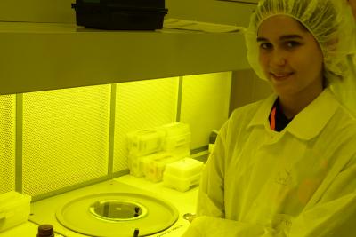 Dass unsere Computerchips aus Sand entstehen, erfuhr Franziska Bauer (16) durch einen Vortrag von Dr. Gernot Ecke. Die Chips bestehen zum Großteil aus Silizium-Einkristallen. Diese sogenannten Silizium-Wafer werden in bis zu 200 Schritten mit ganz verschiedenen Techniken beschichtet. Ein Beispiel ist, dass man unter großer Hitze den Wafern Sauerstoff zusetzt. Dadurch wird die oberste Schicht zu SiO2, also wieder zu „Sand“, einem guten Isolator. Franzi betrachtete durch verschiedene Mikroskope die im Mikrometerbereich liegenden Strukturen und durfte im Labor ein paar Schichten auf die Einkristalle auftragen.