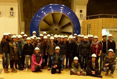 „Die Bergspitze wurde weggebaggert und ausgehöhlt um ein tausend Meter großes Wasserbecken zu erbauen“, berichtet Mary Schönauer (17) vom Besuch des größten deutschen Pumpspeicherkraftwerks Goldisthal. Einen knappen Kilometer tief in den Berg führt ein Stollen zu den Turbinen und Generatoren. Goldisthal kann nach 90 Sekunden Anlaufzeit 60% der Energie eines großen Wärmekraftwerks produzieren. Es wird vor Allem während der Mittagszeit und in den frühen Morgenstunden eingesetzt um die Spitzenlasten im Stromnetz aufzufangen. Gibt es viel Sonnen- oder Windenergie, so wird diese zwischengespeichert, indem die Turbinen Wasser vom Unterbecken ins Oberbecken pumpen. „Acht Stunden lang könnte das Kraftwerk ganz Thüringen mit elektrischer Energie versorgen – doch müssen solche Vorteile gegen die Eingriffe in die Natur abgewogen werden“, so Schönauer.