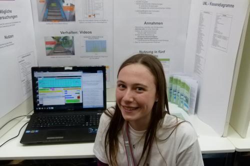 Jeden Tag bilden sich Staus auch auf der Treppe des Fahrradkellers des MBG, wenn bis zu 10 Schüler in einer Minute hinein oder hinaus wollen. Simone Jaud (Q12) beobachtete deren Entstehung in der Realität und simulierte sie anschließend mit einem Java-Programm. „Besonders wichtig war mir, die Realität möglichst genau abzubilden“, so Simone Jaud. So maß sie Fahrradgrößen und Schiebegeschwindigkeiten, bildete die Geometrie der Treppe präzise im Computer nach und übertrug wissenschaftliche Erkenntnisse der Verkehrsdynamik auf ihr Modell. Dieses ermöglicht die Geschwindigkeit der einzelnen Schüler, ihre Anzahl, den Mindestabstand, den sie einhalten, und ihre Ankunftszeit an der Treppe variabel zu gestalten und Auswirkungen auf die Stauzeiten zu ermitteln. „Mit dem Programm könnte man verkehrsdynamische Untersuchungen auch in Ausnahmesituationen wie einer Evakuierung durchführen und prüfen, ob der Fahrradkeller im Ernstfall besser geschlossen wird, wenn die benötigte Zeit nicht vorhanden wäre.“ Ihre Betreuungslehrerin Christine Seliger ist begeistert von der Sorgfalt und dem Zeitaufwand, den Simone betrieben hat. „Ihre gründliche Arbeitsweise ermöglicht eine fundierte Arbeit. Davon wird Simone im Studium und auch danach sehr profitieren.“ Die Jury belohnte Simones Untersuchungen mit einem Sonderpreis.