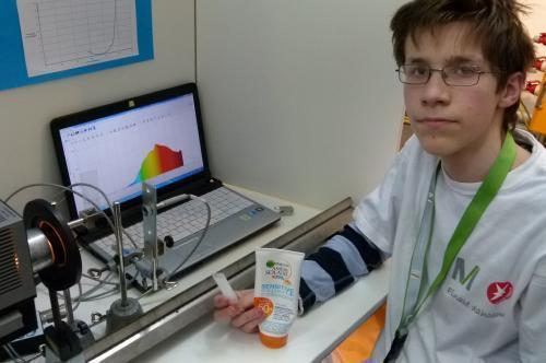 Auf Sonnencremes ist der Lichtschutzfaktor angegeben. „Aber halten die auch, was sie versprechen?“, wollte Markus Huber (Klasse 8c) wissen und maß nach. Dazu durchleuchtete er einen dünnen Film aus Sonnencreme mit ultraviolettem Licht und maß die Intensität des durchkommenden Lichts. Diese setzte er ins Verhältnis zur Intensität ohne Sonnencreme. Der Elternbeirat und das Max-Born-Netzwerk finanzierten das hochempfindliche Photospektrometer, das gleich noch in einem weiteren Projekt eingesetzt wurde. Tatsächlich übertrafen die Sonnencremes den angegebenen Schutz sogar – vorausgesetzt, es wurde dick genug aufgetragen. „Allerdings gibt es Cremes, die so dickflüssig sind, dass es kaum möglich war, die von Dermatologen empfohlene Menge von 2 Milligramm pro Quadratzentimeter Hautfläche zu verteilen.“ Es bildeten sich Löcher im Sonnenschutz, die wesentlich mehr UV-Licht durchließen. Außerdem bekamen einige Proben mit der Zeit Risse im Schutzfilm, durch die schädliche Strahlung drang. Markus' Arbeit zeigt deutlich, wie wichtig es ist, genügend Sonnencreme zu verwenden und den Schutz immer wieder aufzufrischen. „Dicke Proben erreichten durchaus Lichtschutzfaktor 250 – allerdings waren die von sichtbar weißer Farbe – nicht gerade hübsch auf der Haut“, lacht Markus. Die Jury war von seiner Arbeit so begeistert, dass sie ihm den dritten Platz in Physik zuerkannte.