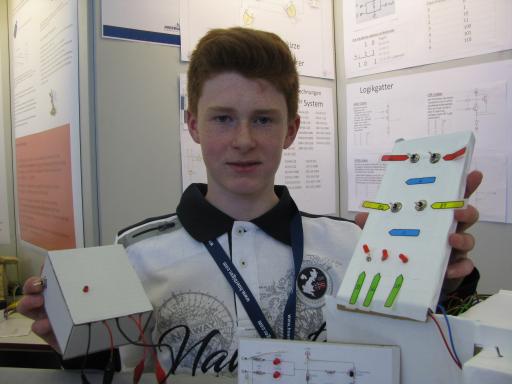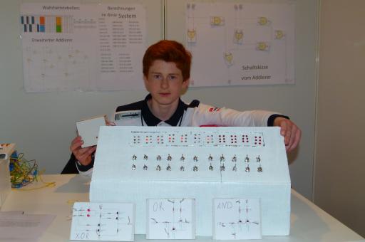 In einer Sommerakademie lernte Ilja die Grundlagen eines Taschenrechners kennen. Mit großem Geschick hat er sich die nötige Kenntnis der Binärzahlen erarbeitet, Wahrheitstabellen aufgestellt und die passende Logikgatter untersucht. Damit konnte er einfache elektronische Schaltungen entwerfen, aufbauen und testen. „Ich habe die insgesamt sieben nötigen Gatter dreimal hergestellt, bis sie zuverlässig funktionierten“, erzählt Ilja, der viel mit Wackelkontakten und kalten Lötstellen zu kämpfen hatte. Ilja entwickelte eine Pappkiste mit Schubfächern, in die alle Schaltungen eingeschoben werden. So bleiben sie für Reparaturen zugänglich. Jetzt kann er Zahlen bis sechs zusammenzählen lassen. „Das scheint vielleicht wenig, aber die Addition von größeren Zahlen funktioniert genau nach dem gleichen Prinzip, nur brauche ich für jede zusätzliche Stelle weitere drei Gatter.“