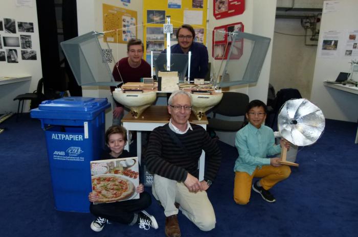 Das Max-Born-Gymnasium bietet naturwissenschaftlich besonders interessierten Schülern von Klasse 5 bis 7 die Forscherklasse an. Hier baute der jüngste Teilnehmer vom MBG unter der Anleitung von Herrn Kautzky und Frau König einen Solarkocher. Acht rundlich geschnittene Dreiecke beklebte Yiqi mit Alufolie und fügte sie zu einem Hohlspiegel zusammen, der auf einer beweglichen Achse aufgeständert wurde. Auf die Sonne ausgerichtet erhitzen die Strahlen Wasser, das sich im Inneren eines schwarzen Filmdöschens befindet.