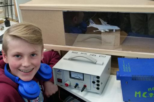 Geschickt hat Roman einen langen Kasten mit Plexiglasfenster konstruiert, durch den er mit einem Ventilator Luft an einem Flugzeugmodell vorbei bläst. „Viel Aufwand trieb er, um Luftverwirbelungen mit Räucherkerzen und Trockeneis sichtbar zu machen“, so Chemielehrer Matthias Fritz, der ihn dabei unterstützte. „Am besten funktioniert es mit einer Nebelmaschine, die mir das Technik-Team der Schule ausgeliehen hat“, berichtet der Jungforscher.