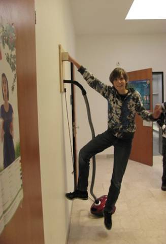 Die Schüler verwendeten zwei Bretter mit Griff und flanschten zwei Staubsauger an, die die Luft hinter den Brettern herausbeförderten. „Damit die Luft nicht nachströmen kann, dichten wir die Ränder mit Gummilippen ab“, erklärt Michael. „Schon bei kleiner Staubsaugerleistung drückt die äußere Luft die Bretter mit solcher Kraft an die Wand, dass wir sie auch mit Gewalt nicht mehr entfernen können.“ Das Brett trägt spielend einen Erwachsenen. Doch wie sollte man ein solches Brett wieder von der Wand entfernen?