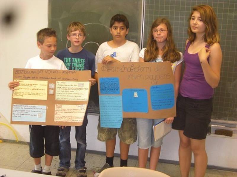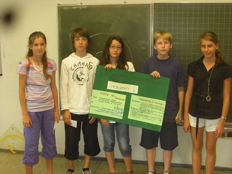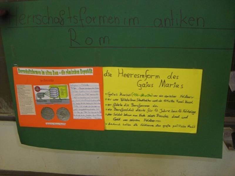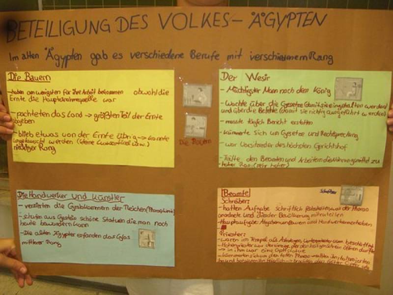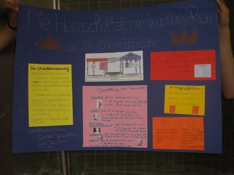 Für die Schüler liegt der Reiz bei diesem Projekt einerseits darin, das zu sichernde Grundwissen dieser Jahrgangsstufe am Ende noch einmal spielerisch zu sichern, andererseits aber auch darin, bekannte Fakten (z.B. Julius Caesar, Augustus, Pharaonen, Athen) mit neuen, selbst recherchierten Fakten zu mischen und daraus eine Präsentation zu erstellen. Über das fachliche hinaus werden durch diese Arbeitsform auch Kompetenzen wie Gruppenarbeit, Recherche (Computerraum, Bibliothek) und die Kunst des Darstellens und Präsentierens trainiert. All diese Kompetenzen wurden Anfang der Jahrgangsstufen 5 und 6 in der „Methodenwoche“ vermittelt, so daß auch hier eine wichtige Stütze der Methodenkompetenz geübt wird.