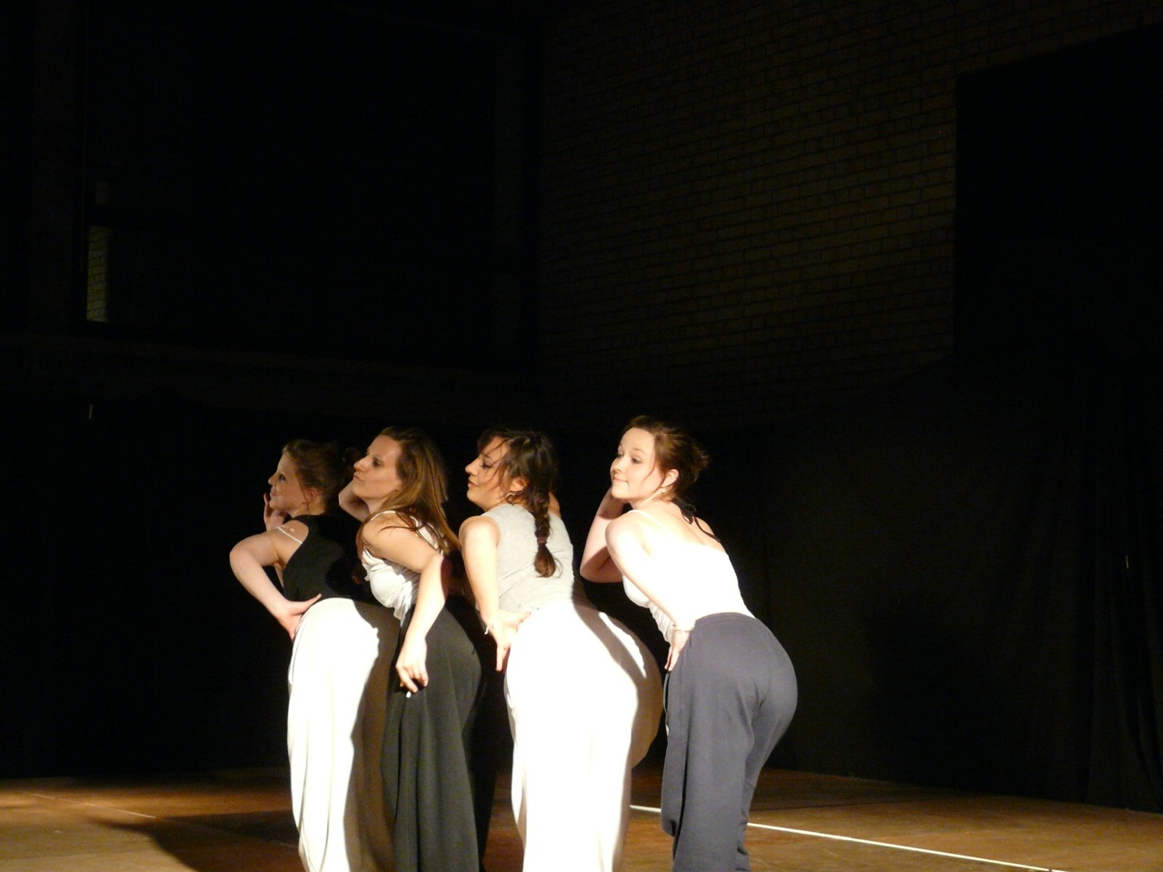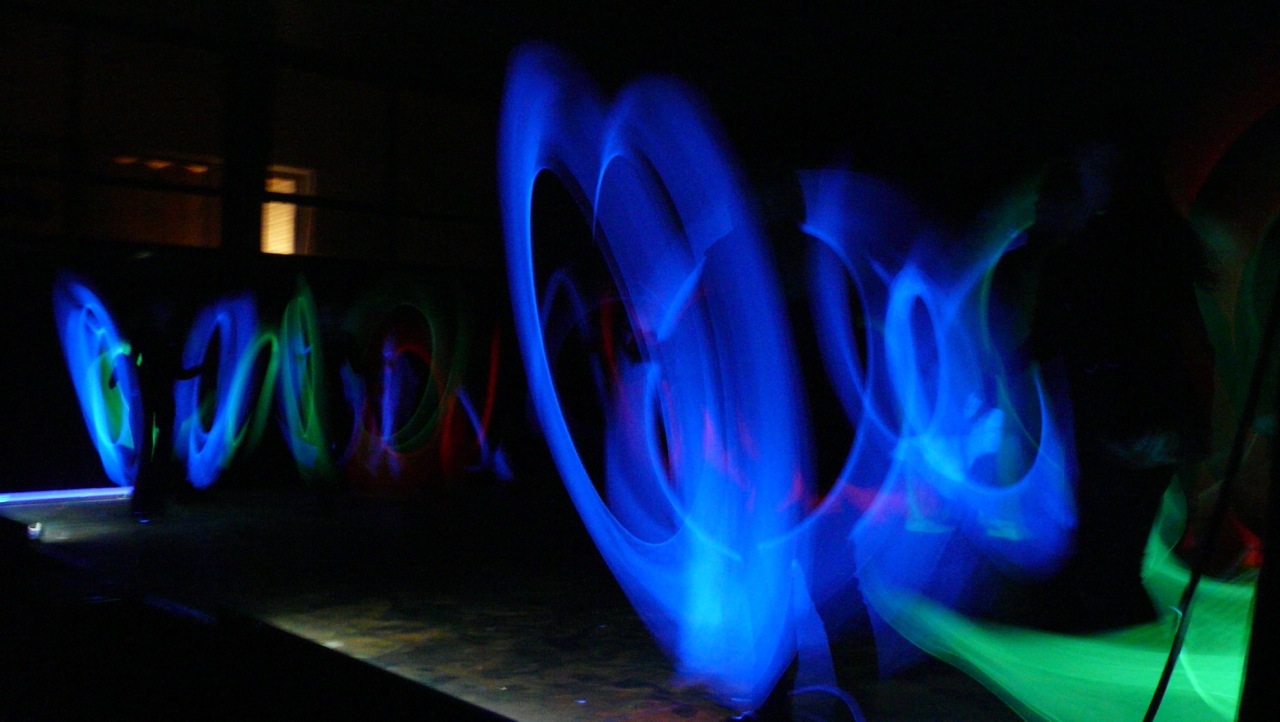 Einige Mädchen aus der Q11 waren so begeistert vom Tanzen, dass ihnen die „Pflicht“ nicht reichte und sie zu ihrer selbst choreographierten „Kür“ etwas ganz besonderes darboten: „Minnih the Moocher“ wurde im Schwarzlicht getanzt, in dem lediglich wenig weißer Stofff sichtbar war. Praktisch körperlos wirbelten so Beine und Hände durch die Dunkelheit – magisch.