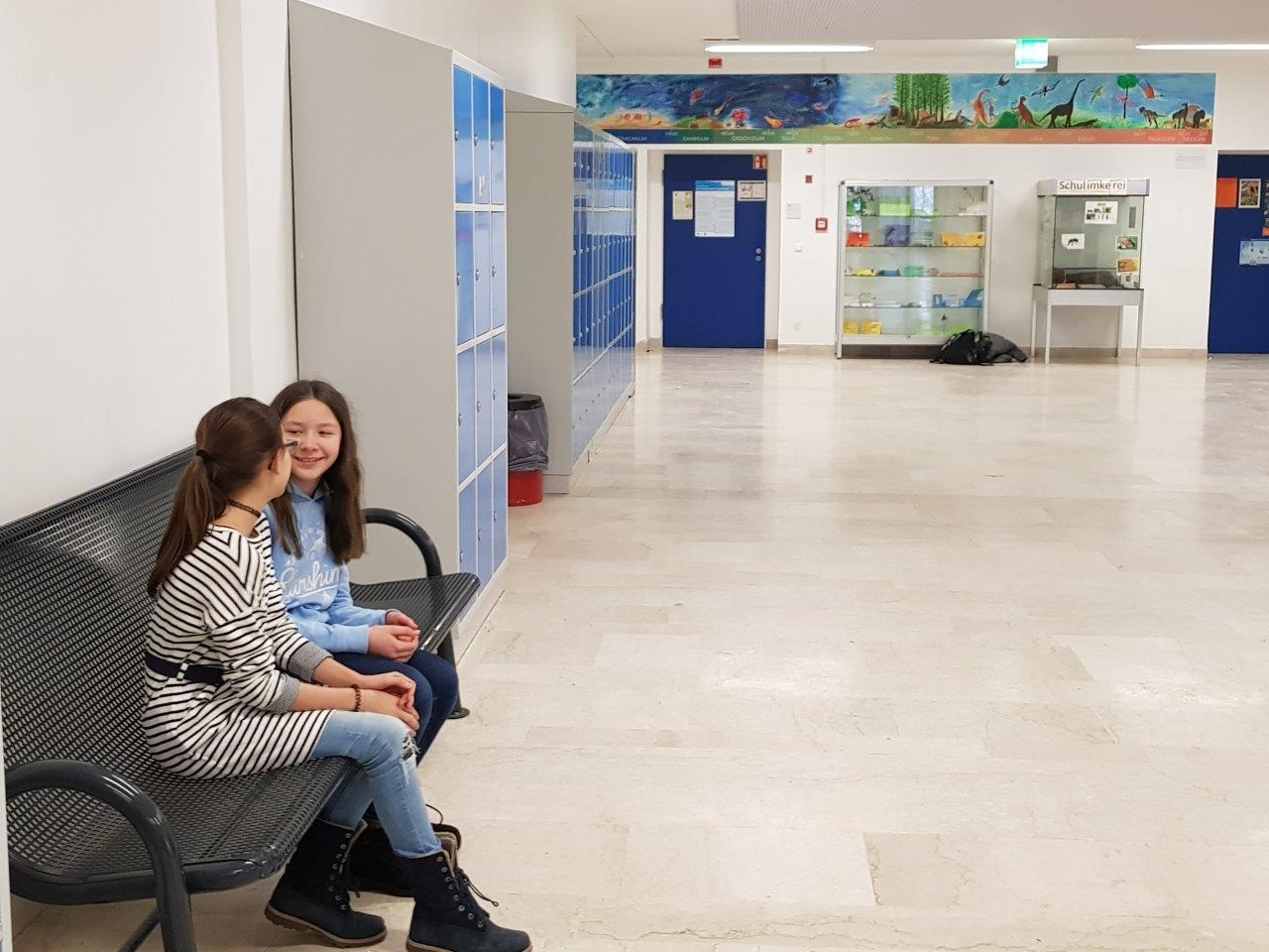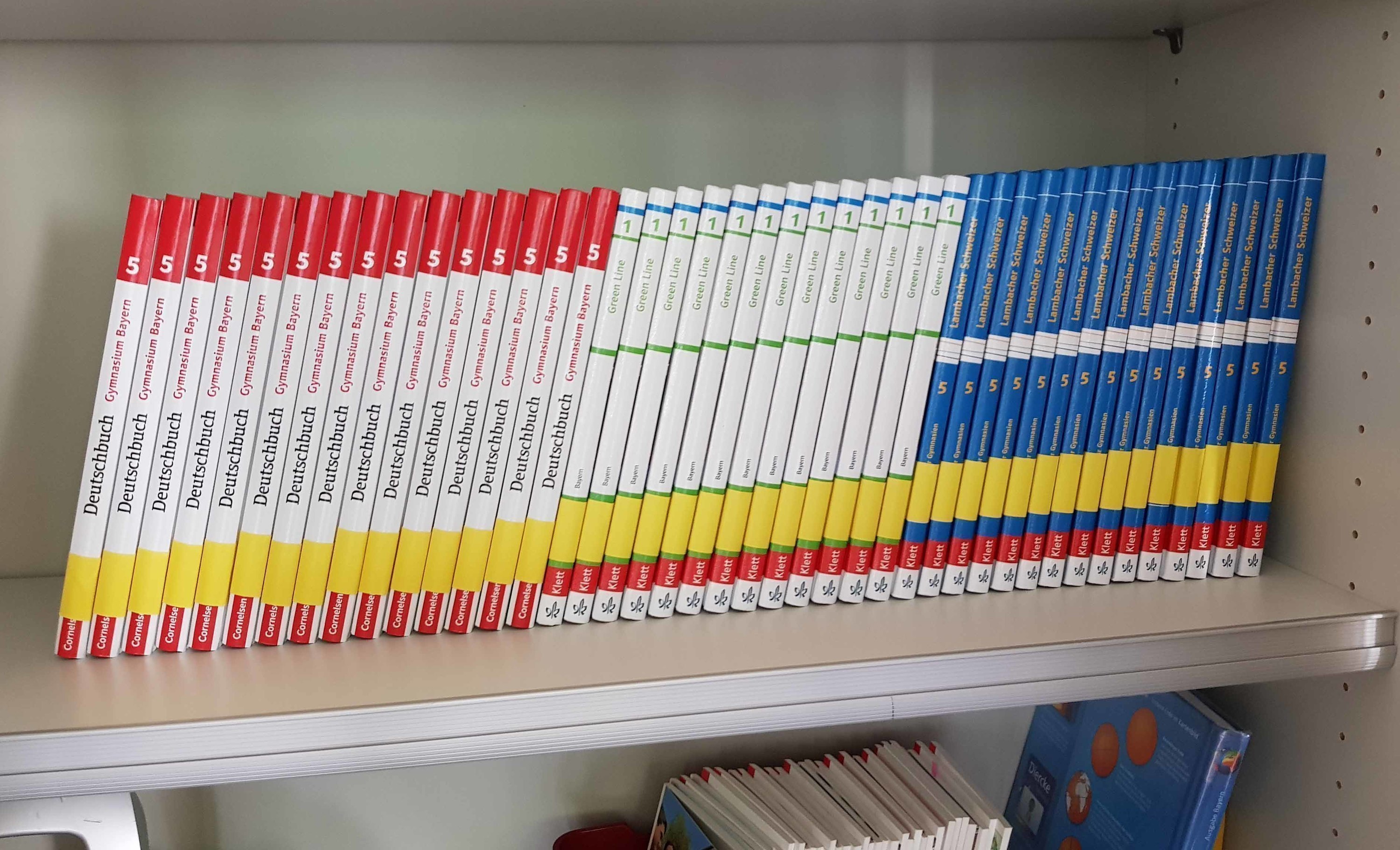 In diesem Schuljahr haben die 5. Klassen nicht nur neue Lehrbücher auf Basis des aktuellen LehrplanPLUS bekommen, sondern es steht ihnen auch ein halber zweiter Büchersatz für die Hauptfächer zur Verfügung. Das bedeutet, dass im Schrank jeder 5. Klasse die Schulbücher für die Fächer Deutsch, Mathematik und Latein bzw. Englisch für das Arbeiten im Unterricht bereit stehen. Jeweils zwei Kinder können gemeinsam in ein Buch sehen. So werden die Schulranzen aller Kinder entlastet, da die Bücher für diese Fächer nicht zwischen Schule und Zuhause hin- und hergetragen werden müssen.