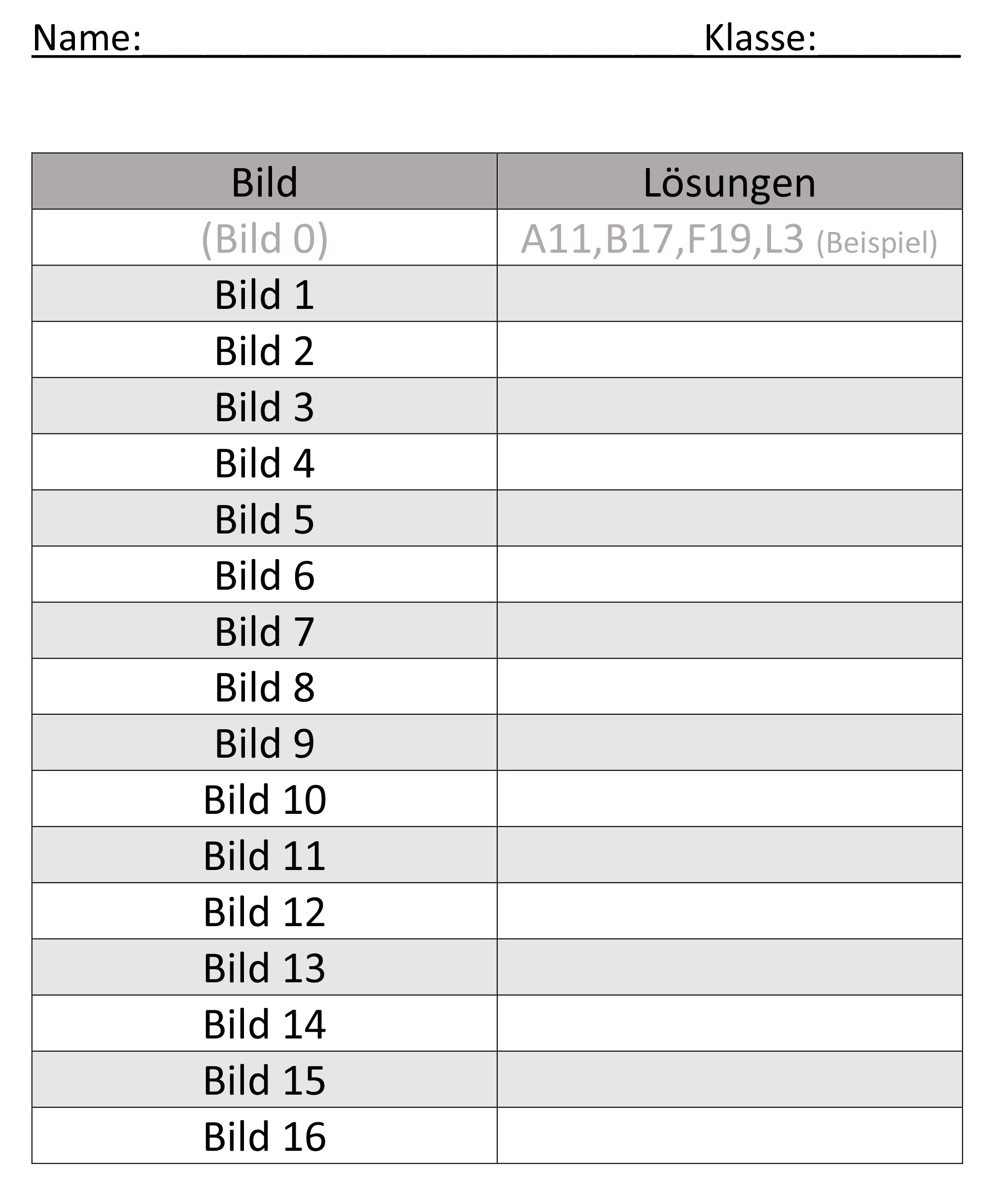 Wenn du ein Ei gefunden hast, notierst Du in welcher Zeile (Buchstabe) und in welcher Spalte (Zahl) es versteckt ist. Das trägst Du in der entsprechenden Zeile der Tabelle ein, die Du unter dieser Anleitung findest. (Dort ist auch ein Beispiel eingetragen, wie das später aussehen könnte). Du kannst die Tabelle ausdrucken und mit einem Stift ausfüllen, oder auch digital bearbeiten (z.B. mit einem IPad). Wenn Du Probleme beim Herunterladen der Tabelle hast, kannst Du Herrn Langemeyer über Teams schreiben, er wird Dir dann eine zuschicken. Wichtig ist, dass Dein Ergebnis nur gezählt werden kann, wenn du diese Tabelle benutzt. Füge bitte noch deinen Namen und deine Klasse hinzu, mach ein Foto von der Tabelle und schick dieses Herrn Wunderlich per Teams.